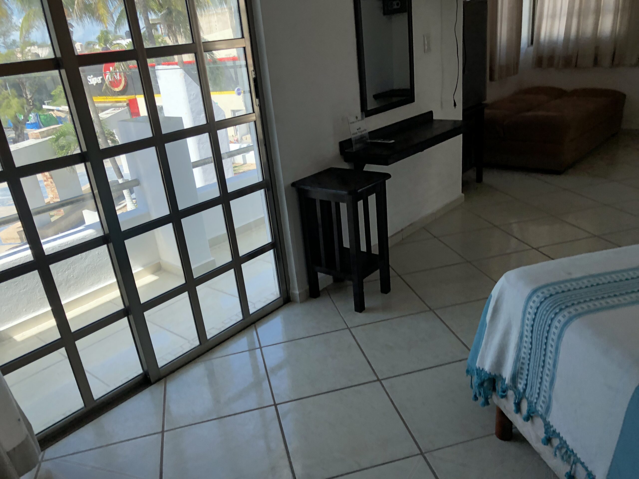 Natural Light: Large sliding glass doors that open to a view of tropical palm trees, filling the room with natural brightness.